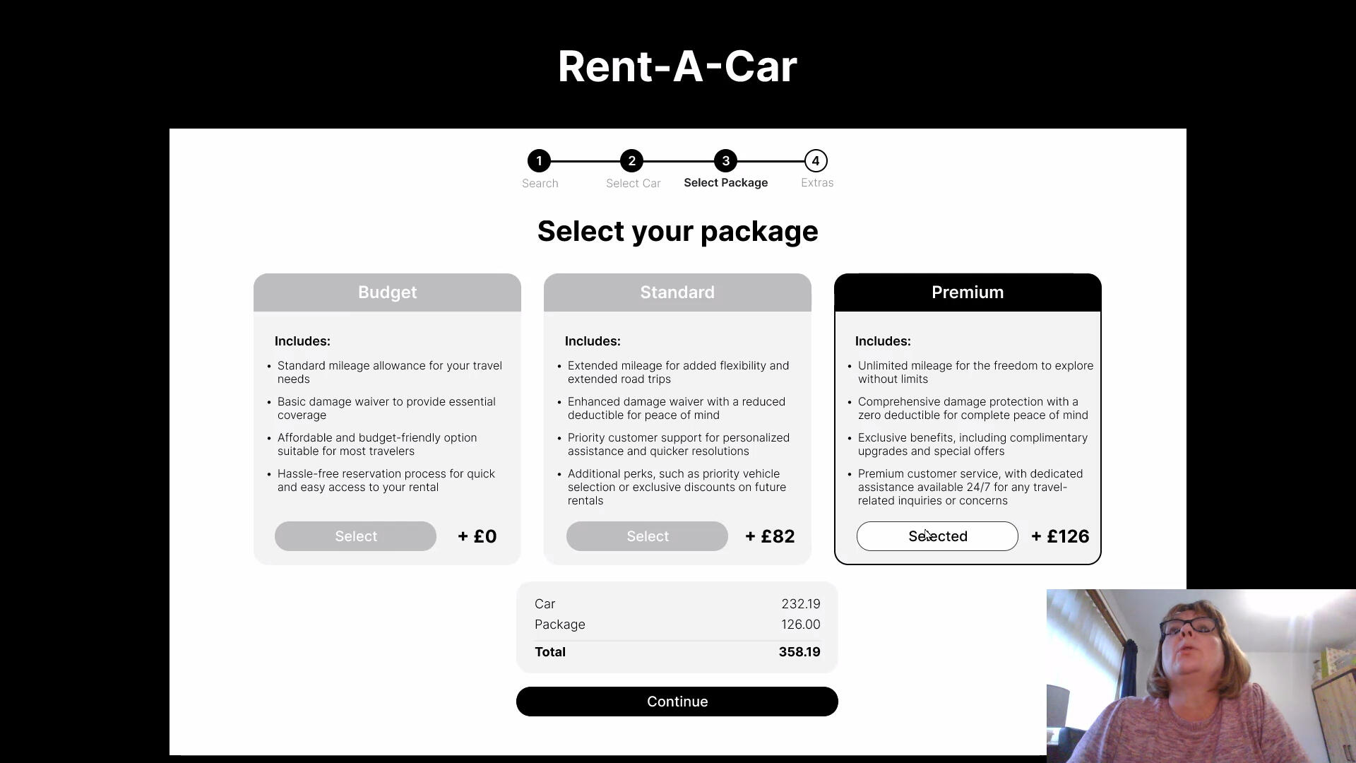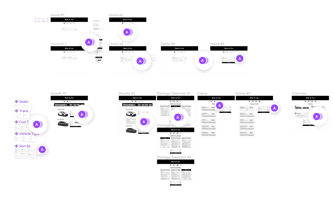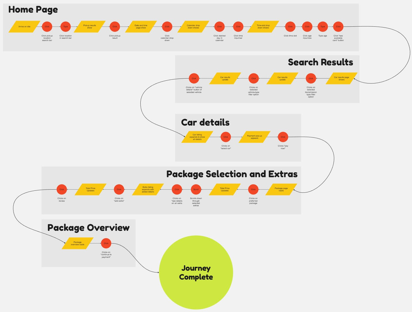 With a fully developed prototype, the next step was to conduct real-world usability testing. I selected a participant with frequent experience using car rental websites and created a custom usability test script covering key user journeys across the site. This process strengthened my skills in designing precise tasks, facilitating sessions, and asking context-specific questions to capture meaningful insights.The test revealed several areas for improvement, including the need for clearer pickup location instructions and confusion between numbered navigation circles and text labels. Recommendations included adding a package details option, enlarging clickable calendar areas, and adjusting oversized text that caused dropdowns to extend off the page.Overall, the usability test validated the design’s effectiveness, showing that users experienced fewer issues with price transparency, navigation, and information clarity. While the educational context of this project limited further iterations, the insights gathered provide a strong foundation for future refinement and development.