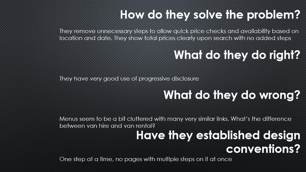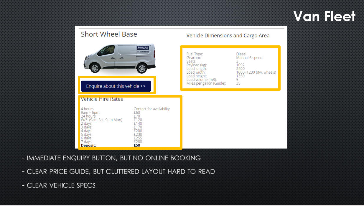 To understand industry standards and identify improvement opportunities, I conducted a competitive analysis of three websites: Aspire Van Hire, Enterprise, and Ace Car & Van Hire. I focused on how each addressed user needs, what worked well, what didn’t, and whether design conventions were established.Findings: