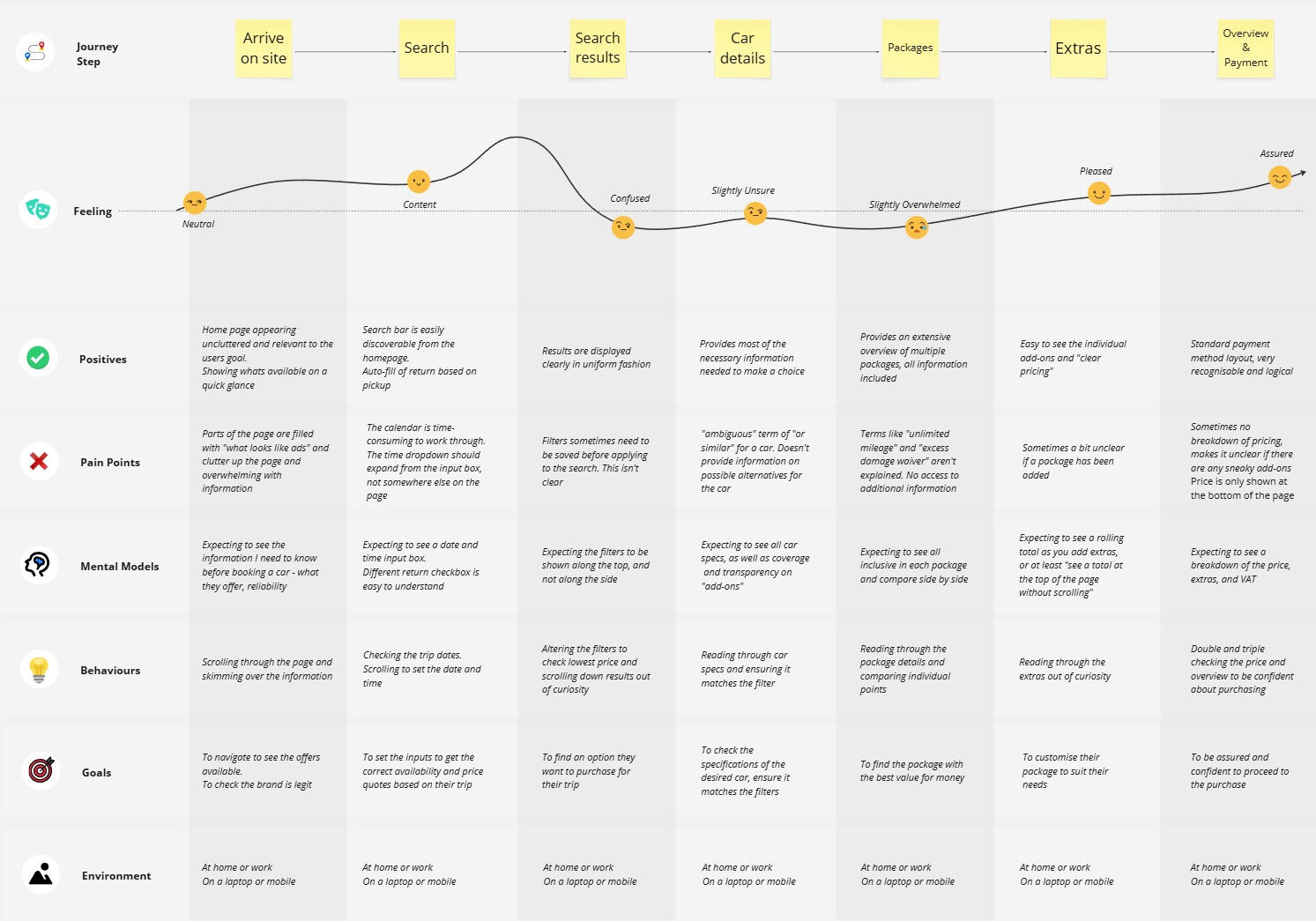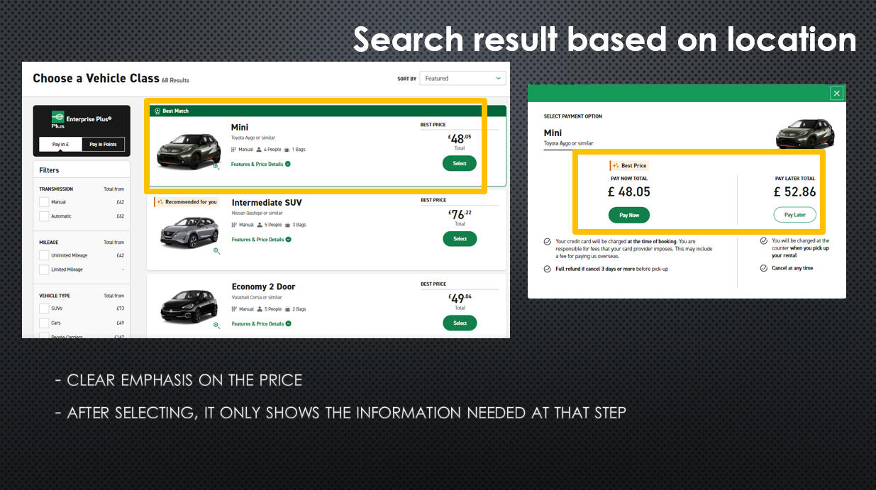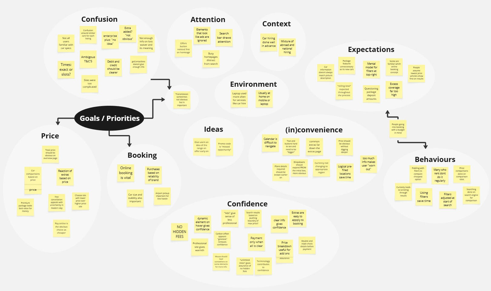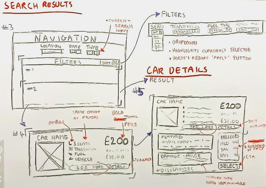 To deepen my understanding of industry standards and user expectations, I analysed two usability tests on popular car rental websites, focusing on user goals, behaviors, and context. I also conducted my own usability test, replicating key tasks to gain first-hand experience in designing test scenarios, engaging participants, and drawing actionable insights.The research revealed several key findings for improving the booking experience. Users valued intuitive navigation with clear search bars and filters for refining results, as well as transparent pricing with detailed cost breakdowns for extras like additional drivers. They preferred visually clear layouts that build trust by avoiding misleading information, and emphasized the need for clarity around industry-specific terms such as “unlimited miles.” Interest in contactless rental options also emerged, highlighting a growing expectation for convenience and safety.