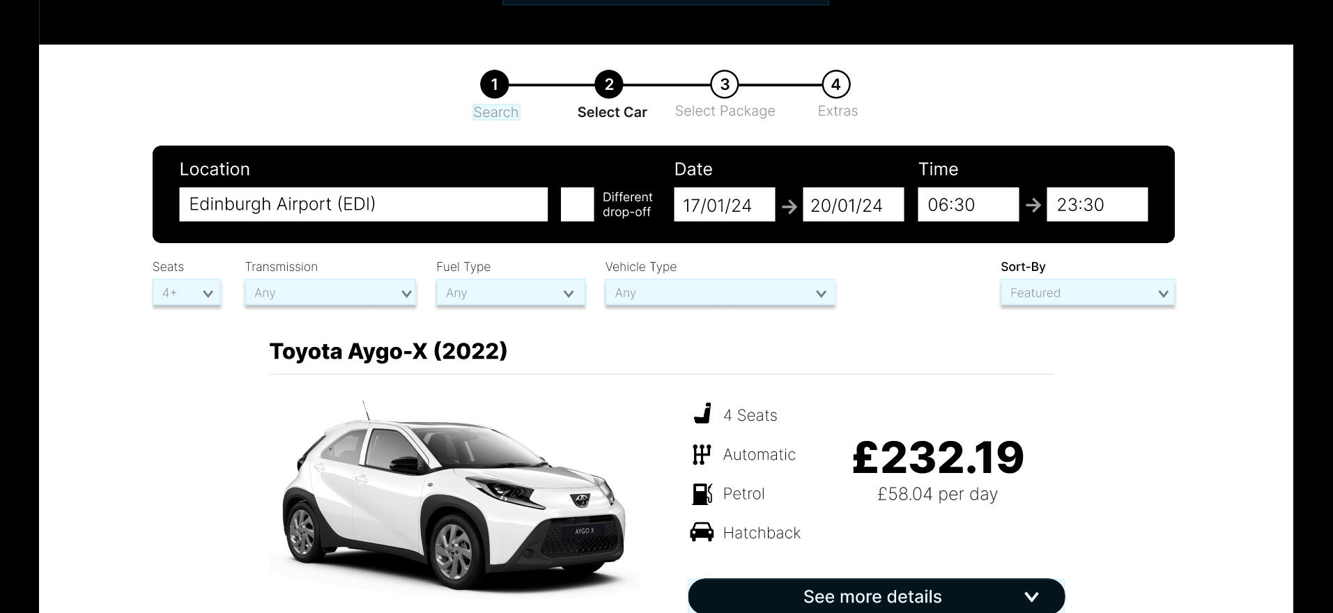 The goal of this project was to optimise the car rental experience by simplifying the booking process, breaking it down into clear steps, while reducing ambiguity between the user and the application regarding fees and industry terminology.