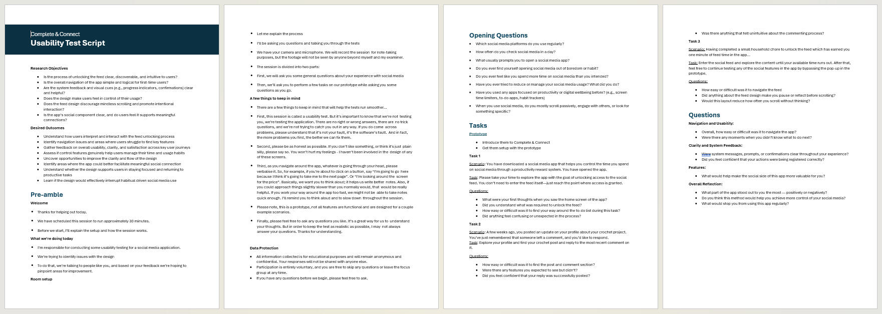 I observed four young adults who felt they used social media more than they wanted to. Over one week, they logged each session’s purpose, duration, platform, and post-use mood. This revealed recurring patterns, motivations, and emotional reactions tied to daily use.Focus Groups