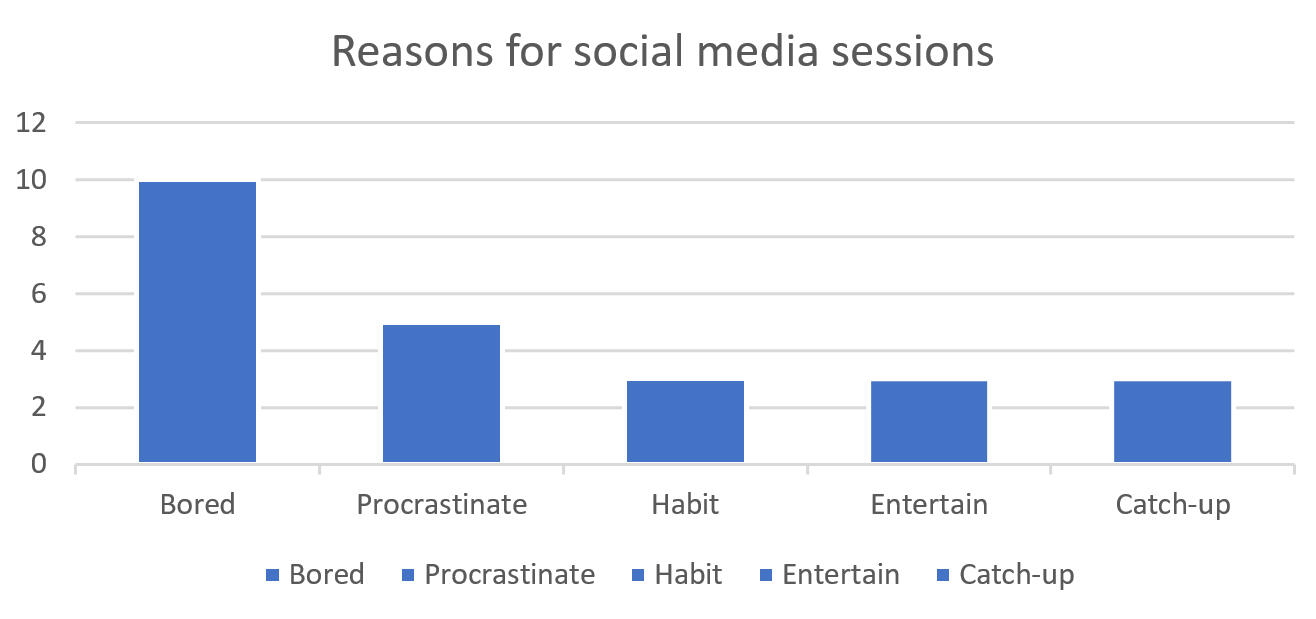 Social media often fills idle moments or accompanies multitasking. Boredom, procrastination, and FOMO were common triggers, with spikes in use during events or algorithmic recommendations. While short, intentional sessions were viewed positively, prolonged use tended to become passive and harmful.Solutions